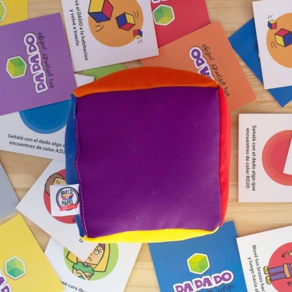 Un primer juego para usar desde los 18 meses en adelante. Contiene un dado gigante suave y blandito con 6 colores diferentes y un mazo de cartas por cada color.