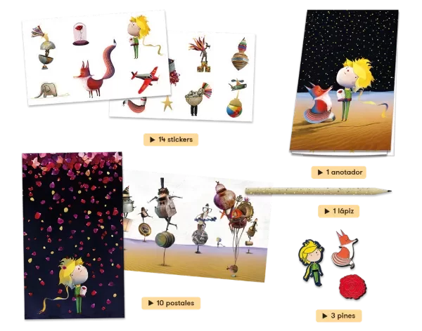 INCLUYE: Tapa con cierre magnético, 1 libro tapa dura 17 x 21 cm, 10 postales, 1 lápiz, 1 anotador, 14 stickers, 3 pines